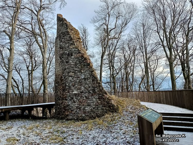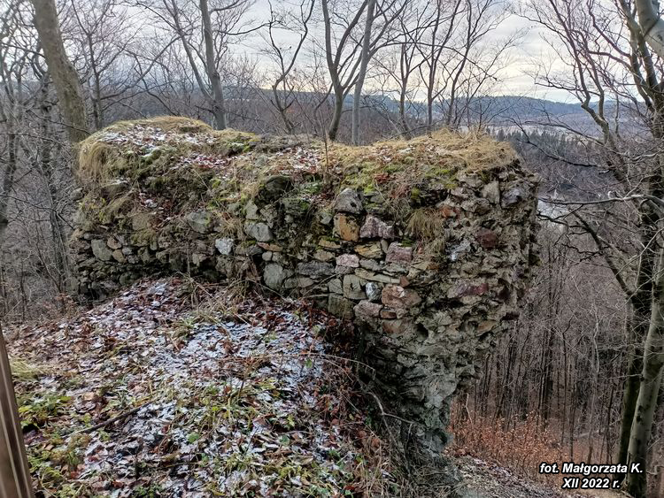 Ruiny XIII wiecznego zamku położone na szczycie foremnego, kopiastego pagórka Gomoła (733 m.n.p.m.), wschodniego krańca Grodczyna (803 m.n.p.m.).