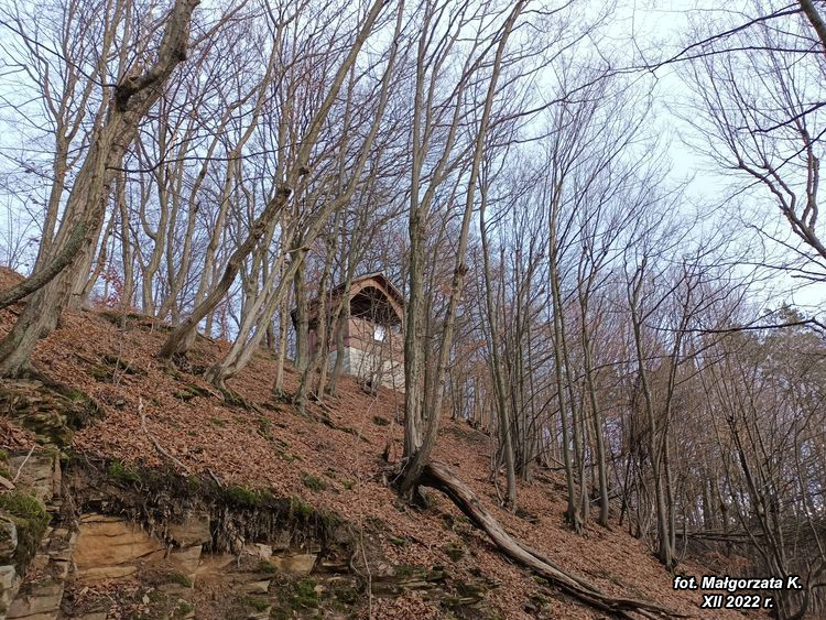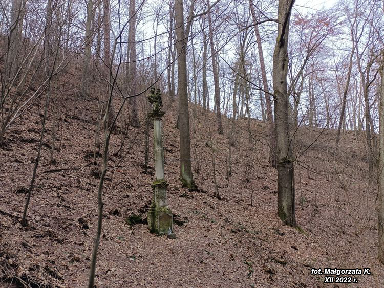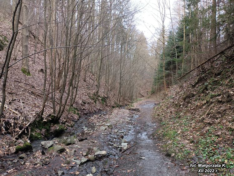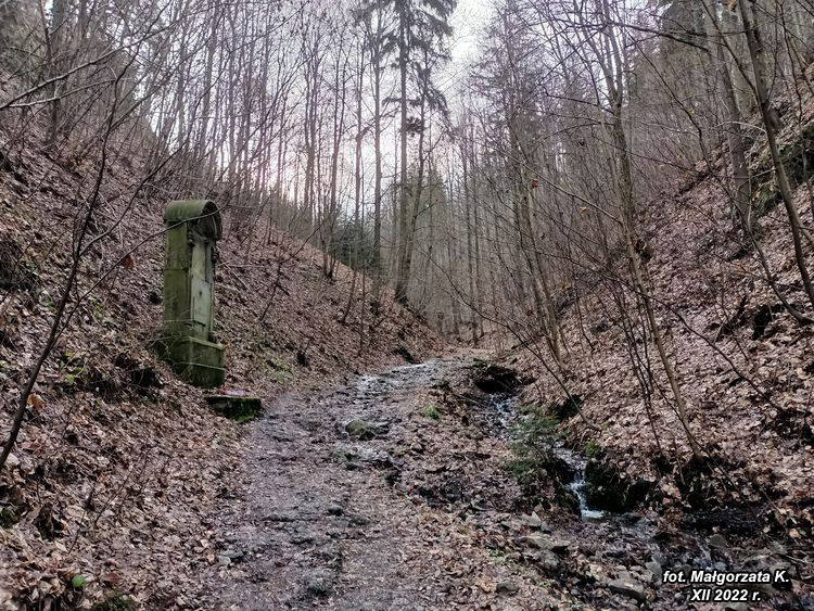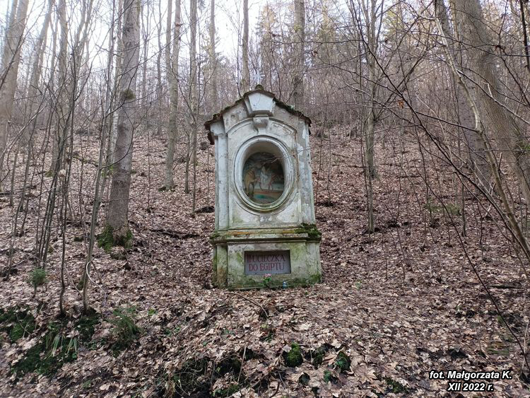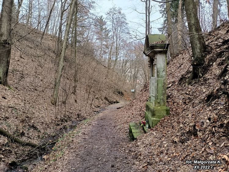 drogi prowadzi malowniczym wąwozem wspólnie z drogą krzyżową przetykaną kapliczkami boleści